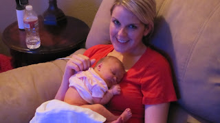 Once it was confirmed that it was baby time, we made the calls to our fam. I didn't want to alert everyone if it was just a false alarm. The doc said she was going to leave me for a few hours so I could progress. I still wasn't feeling anything even though the monitor showed I was contracting. About two hours later, they came and checked me and told me that since my water broke, I could get my epidural at any time. I opted to get it then before the pain hit. The nurse told me not to worry about the pain bc everyone tells her that her iv hurts worse than the epi. She was totally right. The anesthesiologist came in and did his thing and it didn't hurt at all. It was a strange feeling of fluid filling up around my spine, but definitely not painful. After getting the epi, they administered some pitocin to speed things along. We settled in and watched some netflixed shows on my iPad. After a couple of hours or so, the doc checked me and I was three cm. They decided to give me some benadryl through my iv in hopes that it would relax me and let me sleep, allowing my body to progress faster. Within seconds of getting the Benadryl, I felt very drowsy. All the visitors left the room so I could sleep. I was on my left side and I was dozing off but could feel a sharp pain low in my abdomen every minute or so. I assumed this was a contraction but I was only feeling it on my right side. Just as it was getting too painful to ignore, the anesthesiologist popped his head in to check on me. I let him know what I was feeling and he turned me up and within seconds the pain disappeared and I was able to continue my nap. After an hour of napping I was checked and was at a 6! I went from barely three to six in an hour. I was flipped to my other side and told to rest for another hour or so. In the meantime, our friend Ryan and my BIL David stopped by. They visited for a little bit in the room with me and then John went out into the waiting room with them so I could sleep. About five minutes after John went into the waiting room, the nurse checked me again. I couldn't believe her when she said I was done, it was time to push! I went from three to ten in an hour and forty five minutes! They went and got John and a team got everything ready for her arrival. Since her head was so low, they didn't think I would have to push for long. I started pushing at 5:40 and at 5:58 Ryleigh Erin Hall was born! She weighed in at 6 lbs 8 oz and was 19.5" long. Pushing was the only part of the whole process that was hard for me. It was seriously the most athletic thing I have done! But, she was born in ten contractions which thy nurses all said was something to brag about because most people push for an hour or two. I really don't know how I would've done that. Ryleigh was handed to me for a second and John cut the cord. Then she was whisked away to be cleaned off and checked since she wasn't crying. All of a sudden, the nurse yells out "can I get some help over here!" and within seconds a team of people were surrounding her including the neonatoloist. I knew that couldn't be good but the doctor assured me that she just had some fluid in her lungs that they needed to clear out and that she was fine. They suctioned her little lungs for about five to ten minutes, and we watched as our little smurf changed from blue to pink. She started to cry and was deemed fit to stay with us instead of heading to the NICU, which was great. They gave her to me and told us visitors could come in if we wanted. I was in a haze for most of this time, and really don't remember much. I think I was still out of it from the benadryl and the pushing. I was completely starving since I hadn't eaten anything since the night before. I really regretted not stopping for breakfast on the way in to the hospital b/c I knew that if I was admitted I wouldn't be allowed to eat. But, it was 4:30 am and I didn't have food on my mind. Anyway, within an hour of her birth, John headed out to pick up food (and smoke a cigar w/ his pals), and the family got to meet Ryleigh. By 8pm I was cleaned up and getting settled in our post postpartum room. Our first night went great. We had to wake her up to feed her, and it has pretty much continued that way ever since. She is a really low key baby. We've only had one rough night and it was after I ate a really spicy meal, so I think that may have irritated her tummy. We came home on Sat morning and have been loving life with our little munchkin. And now for the photos...